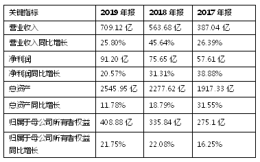 2019年,公司完结运营收入709.12亿元,同比增加25.80%;运营赢利132.97亿元,同比增加20.13%;完结归属于母公司所有者净赢利91.20亿元,同比增加20.57%。到2019年12月31日,公司总资产2545.95亿元,同比增加11.78%;归属于上市公司股东的所有者权益408.88亿元,同比增加21.75%。公司各项运营政策均坚持了杰出的增加态势。