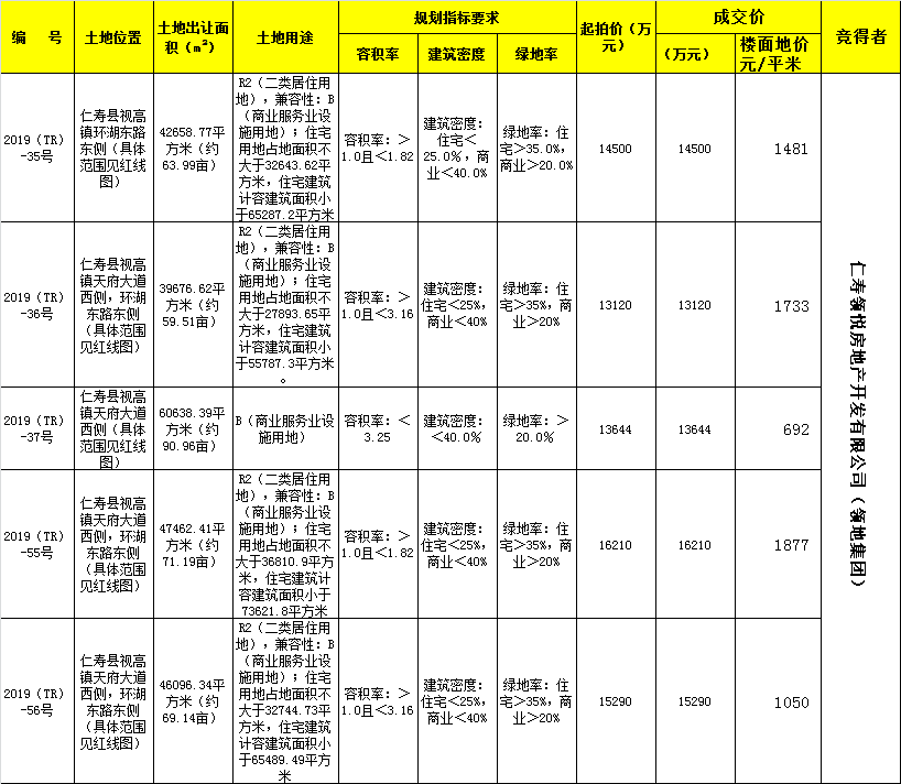 乐居买房讯2020年4月9日,仁寿县视高镇进行了一次土地拍卖,五宗土地合计354.79亩,悉数由仁寿领悦房地产开发有限公司底价竞得,该公司是领地集团的全资子公司,土地出让价款约7.2764亿元人民币,楼面地价悉数不超越2000元/平米。