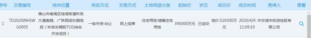 中国网地产讯 4月9日,佛山市南海区1宗商住用地成功出让,终究,中交城市出资控股有限公司以52.65亿元竞得,溢价率35%。