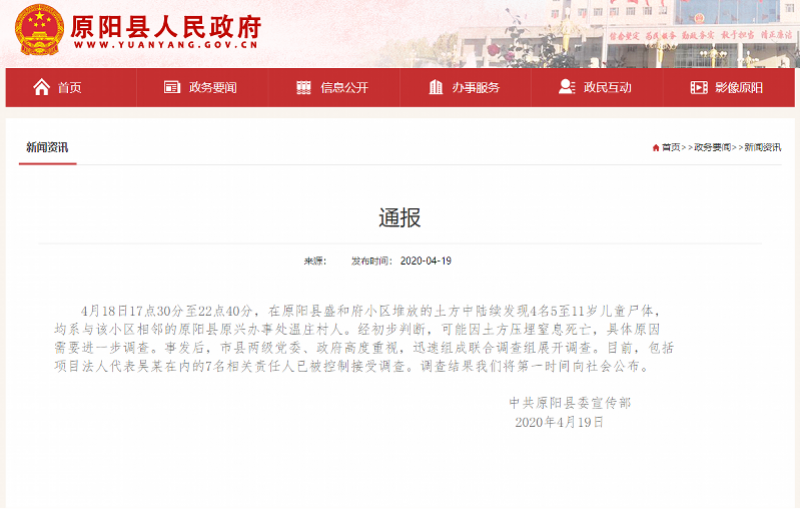 4月19日,河南省新乡市原阳县委宣传部通报,4月18日17点30分至22点40分,在原阳县盛和府小区堆积的土方中连续发现4名5至11岁儿童尸身,均系与该小区相邻的原阳县原兴办事处温庄村人。经初步判断,或许因土方压埋窒息逝世,详细原因需求进一步查询。现在,包含项目法人代表吴某在内的7名相关责任人已被操控承受查询。南都记者了解到,该项目为正在开发的楼盘,原定4月19日上午与物业参谋方举办服务协作签约典礼。