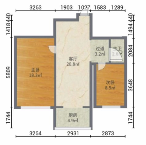 下面是简略的平面户型图,两室两厅一厨一卫格式,该有的悉数都有。